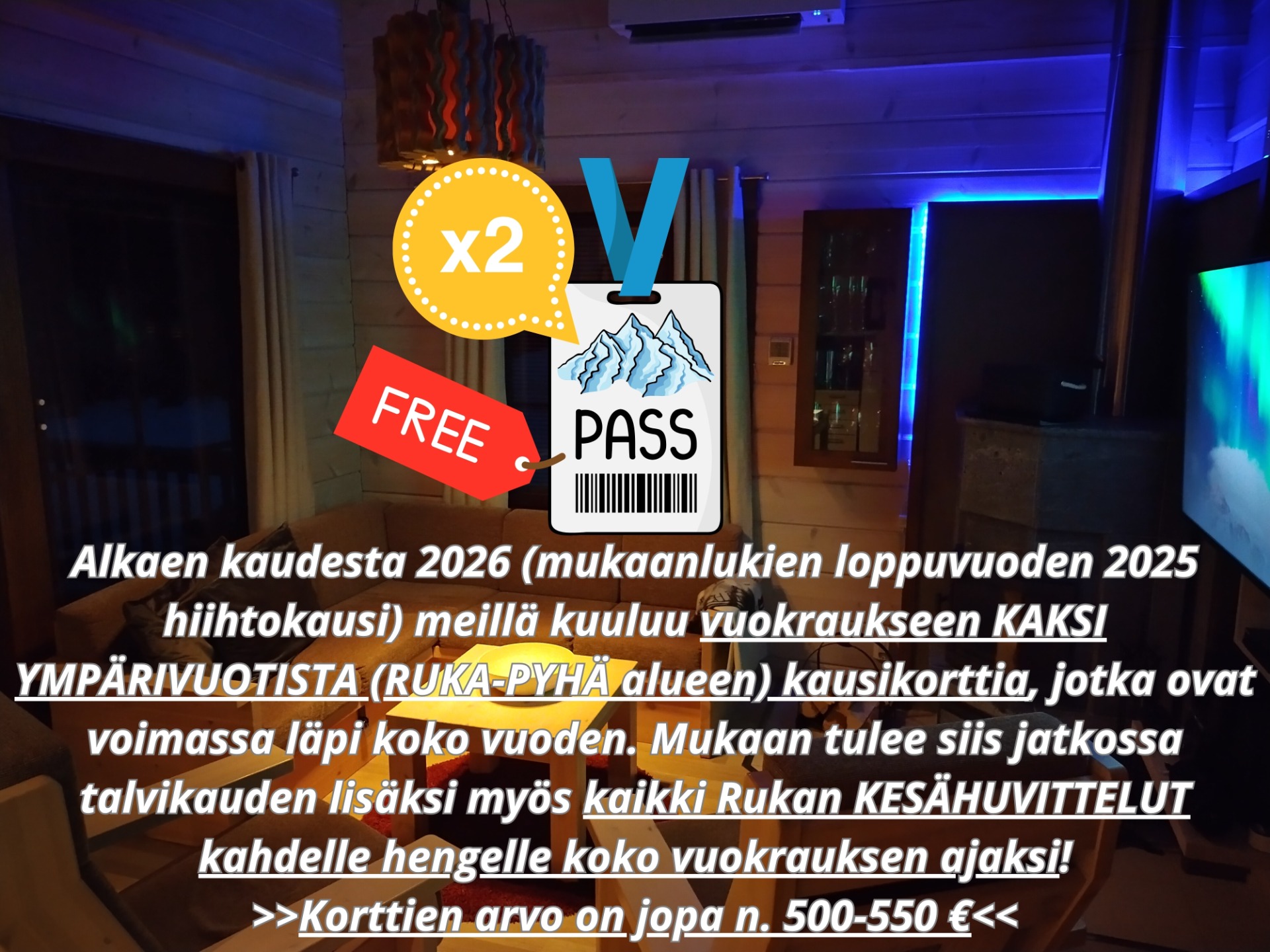 Alkaen kaudesta 2026 (mukaanlukien loppuvuoden 2025 hiihtokausi) meillä kuuluu vuokraukseen KAKSI YMPÄRIVUOTISTA (RUKA-PYHÄ alueen) kausikorttia, jotka ovat voimassa läpi koko vuoden. Mukaan tulee siis jatkossa talvikauden lisäksi myös kaikki Rukan KESÄHUVITTELUT kahdelle hengelle koko vuokrauksen ajaksi!